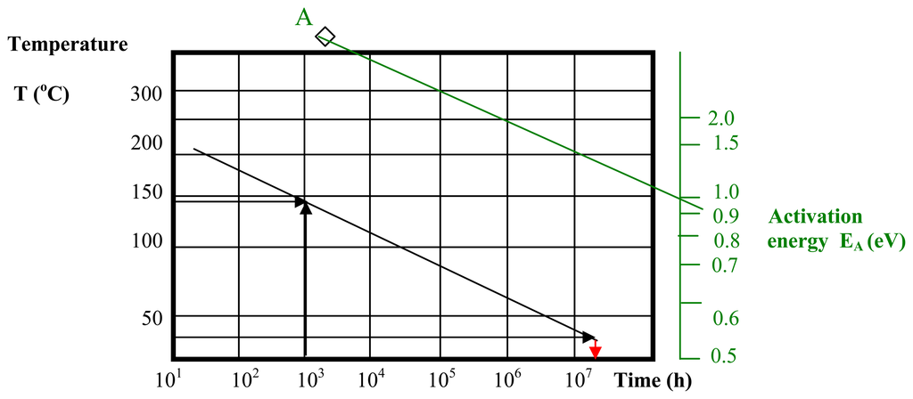- First, the calculus is executed for the activation energy of 1 eV, and then the modifications induced by a smaller value of the activation energy (0.8 eV) will be discussed. On the Arrhenius plot (Figure 6), the line corresponding to the activation energy of 1eV (green line) is drawn by the point A and the corresponding value on the scale with activation energy. A line parallel with this one (having the same slope), drawn by the point calculated at the previous step (1000h;145°C), describes the acceleration induced by the temperature to the failure mechanism. The intersect of this line with the ordinate of 25°C defines in the abscissa the median time for the distribution of failure rates at room temperature (25°C) of the batch affected by this failure mechanism, which is 2 × 107 h (see red line).