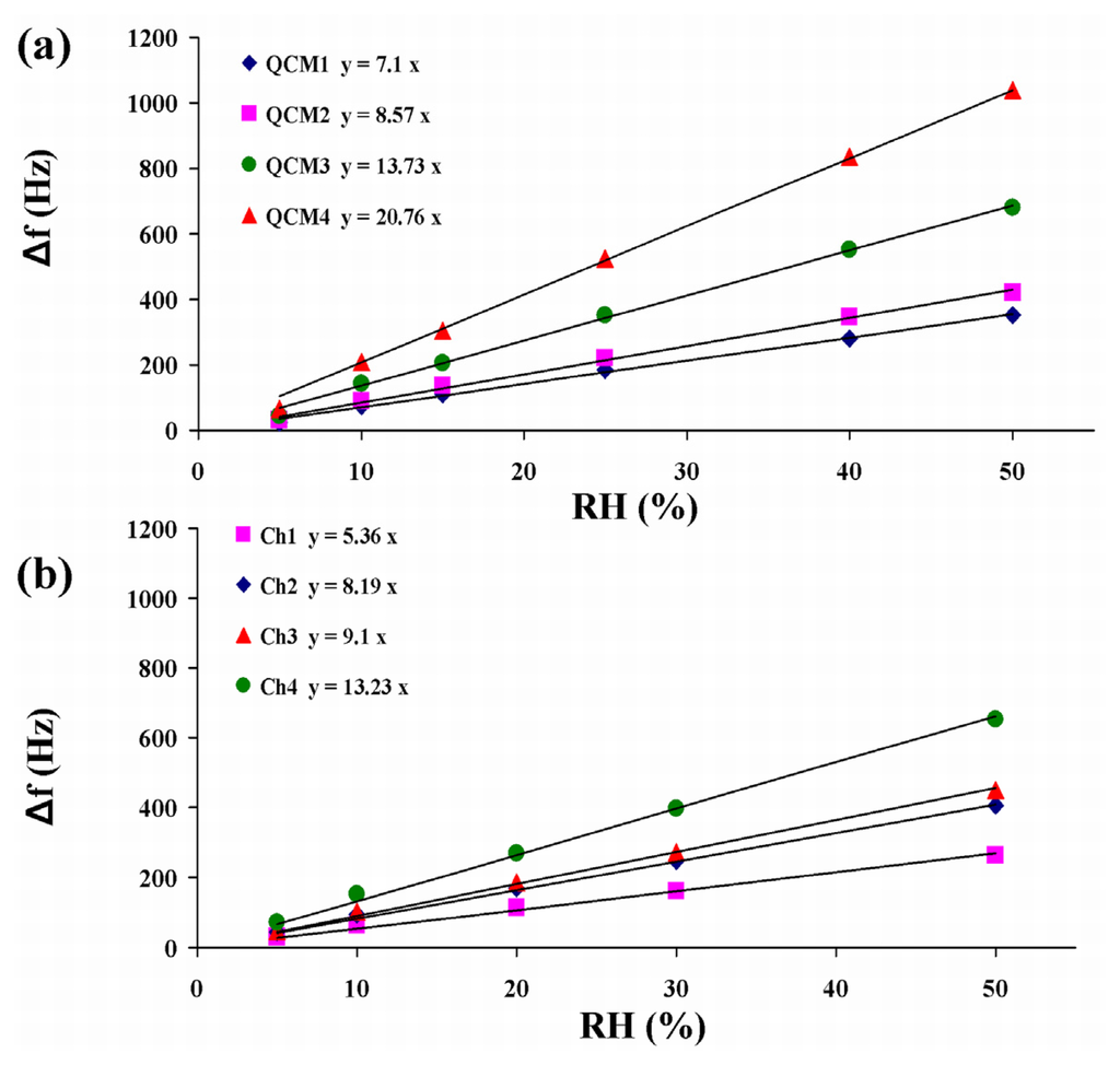 Responses of the QCM sensors (a) and MQCM channels (b) vs. relative humidity variation. Data are fitted by straight lines with angular coefficients representing the sensitivity of each sensor, see (2).