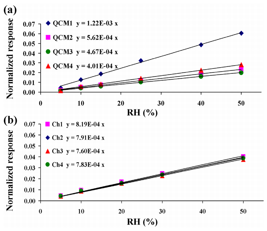 Normalized responses of the QCM sensors (a) and MQCM channels (b) vs. relative humidity variation.