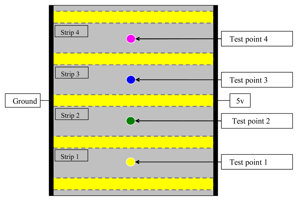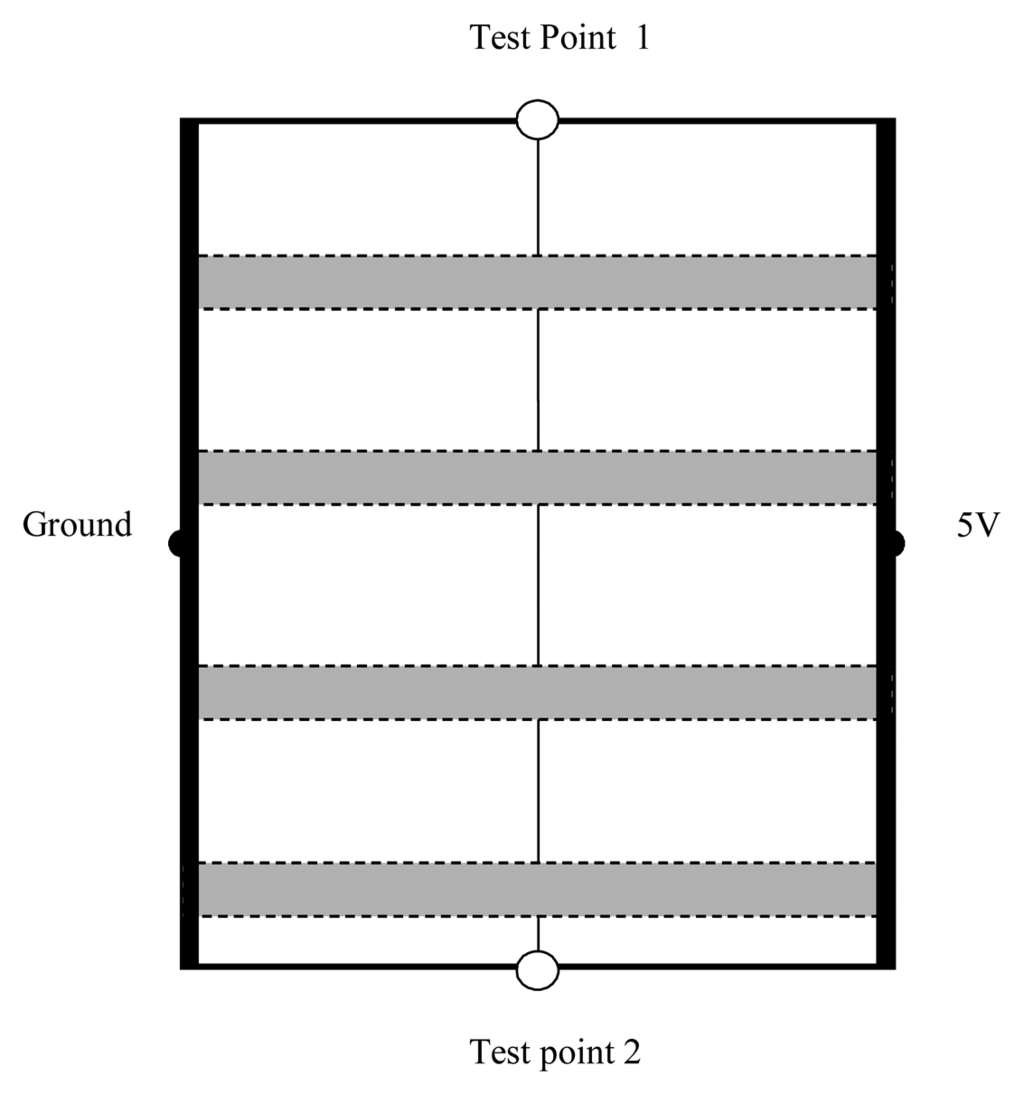 In the first scenario the conductive thread between the strips was not cut. As explained earlier, if the resistance between test points 1 and 2 in the following figure is measured, the value is practically the same because they are connected by a conductive thread. Based on this reasoning, the measurements taken were only in respect of one of the test points in Figure 5 and earth.