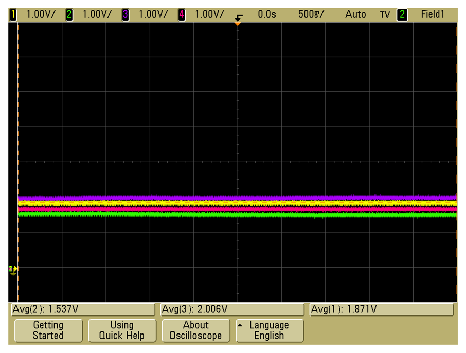 In Figure 6, the signal corresponding to the measurement point is the green one. It can be seen that the level is 2.6v, which is approximately half the voltage applied to the fabric, and following that, how the signal changes when a weight of 100 grams is applied to the right-hand side of the test piece (Figure 7). It should be noted that the starting voltage is not the same as in the previous figure because the graphs have been obtained in repeated tests in the same scenario and clearly the values obtained vary slightly due to the recovery of the fabric.