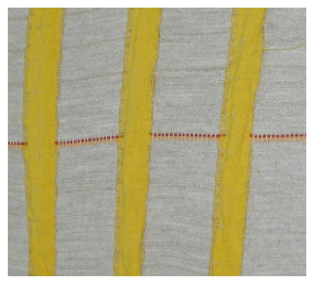 In Figure 4 it is possible to see two different strips, some yellow and some grey. The yellow colored strips are non-conductive while the grey-colored strips contain a percentage of a conductor. The direction of the weave (using Figure 4 as the reference) is horizontal. The two sections of fabric also contain a percentage of Lycra to improve their ability to recover the original shape after being deformed. The fabric was obtained without cutting the threads when they were passed from one strip to another. That is, at the back of the fabric the conductive thread passes behind the non-conductive thread until it reaches the point where the next conductive strip starts [8].