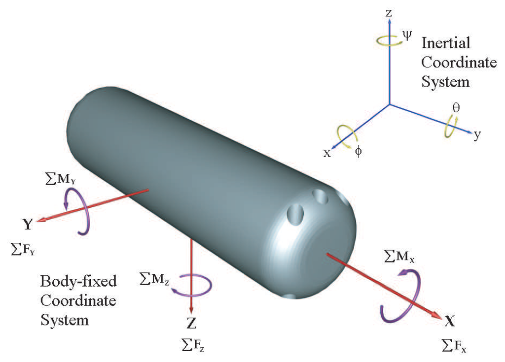 “Body-fixed coordinate system (frame)” and “inertial coordinate system (frame)” are used with conventional aerodynamics definitions in the current investigation (Figure 1). The origin of the body-fixed coordinate system is located at the center of buoyancy (center of geometry). (x, y, z) and (ϕ, θ, ψ) are the position and orientation of Sensor Fish with respect to the inertial coordinate system. Suppose Q is the corresponding homogeneous transformation, then