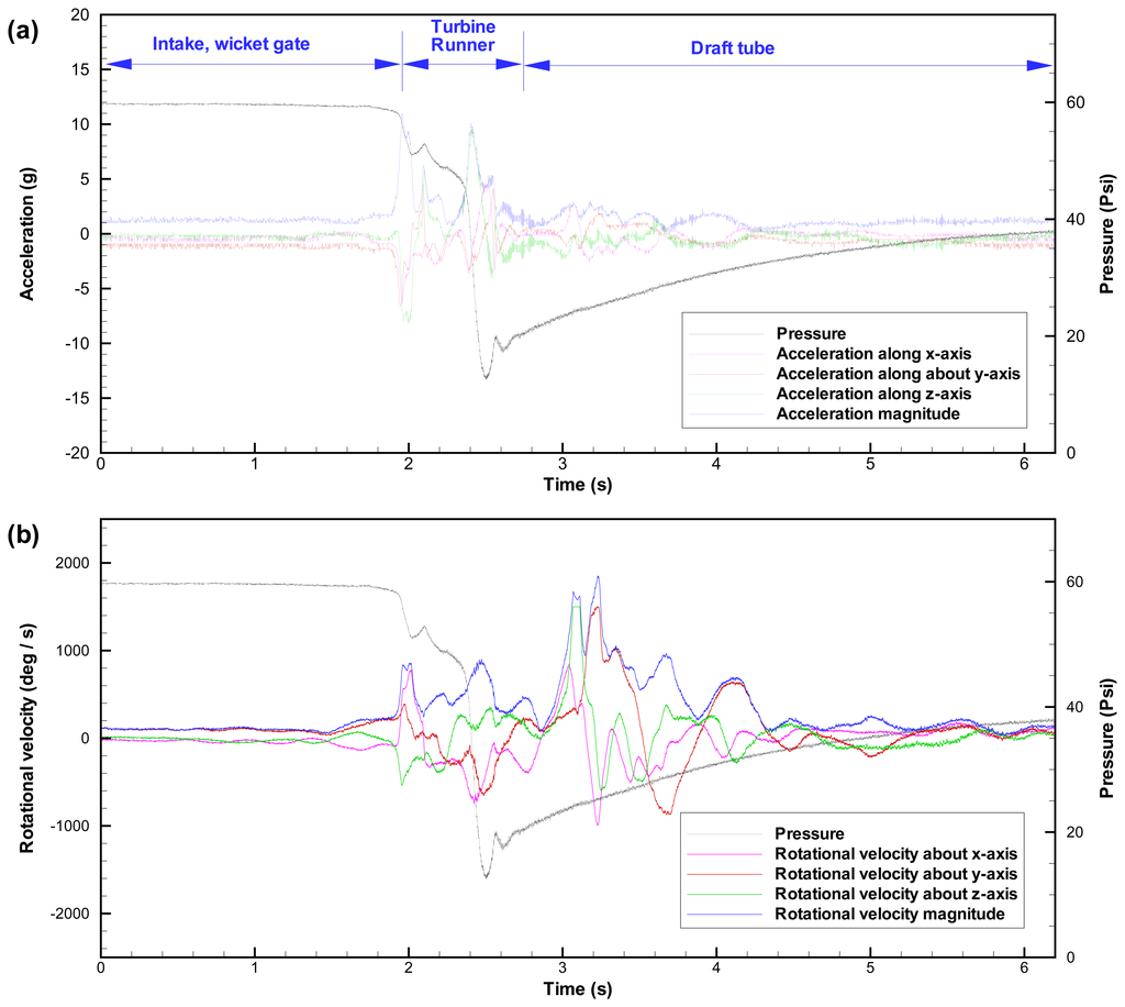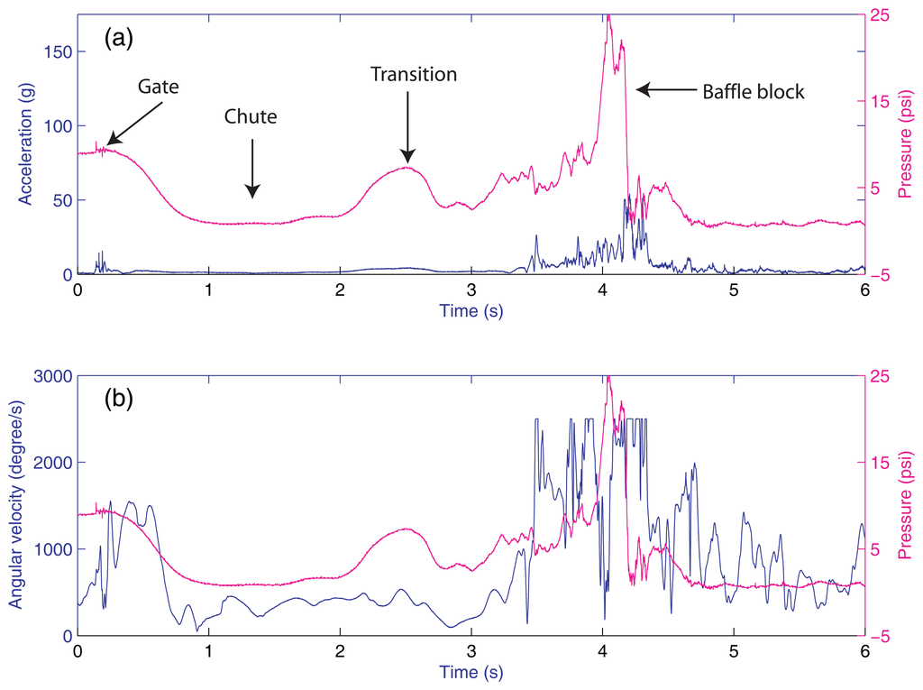 An example of measurements by Sensor Fish released from the intake of Turbine Unit 9 of the John Day Dam: (a) acceleration; (b) rotational velocity.