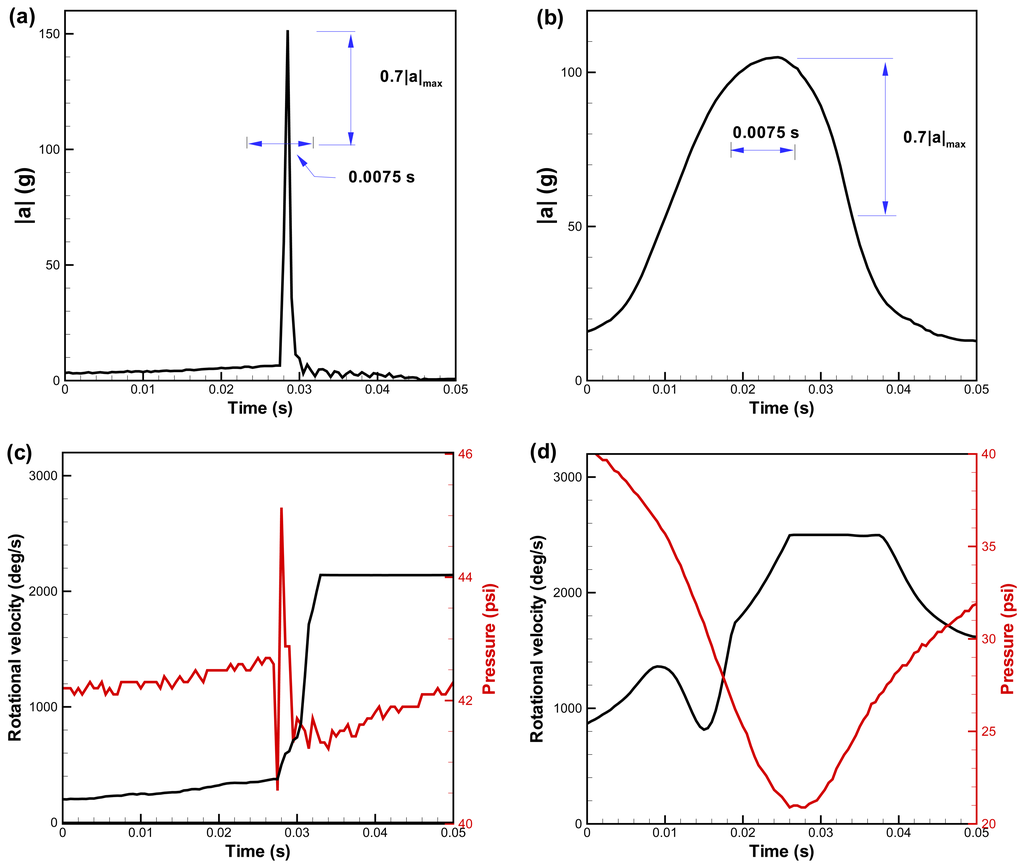 Duration of acceleration within 70% of the peak value is (a) less than 0.0075 second for a collision event; (b) longer than 0.0075 second for a shear event. Pressure and rotation increase more dramatically during (c) a collision event than during (d) a shear event.