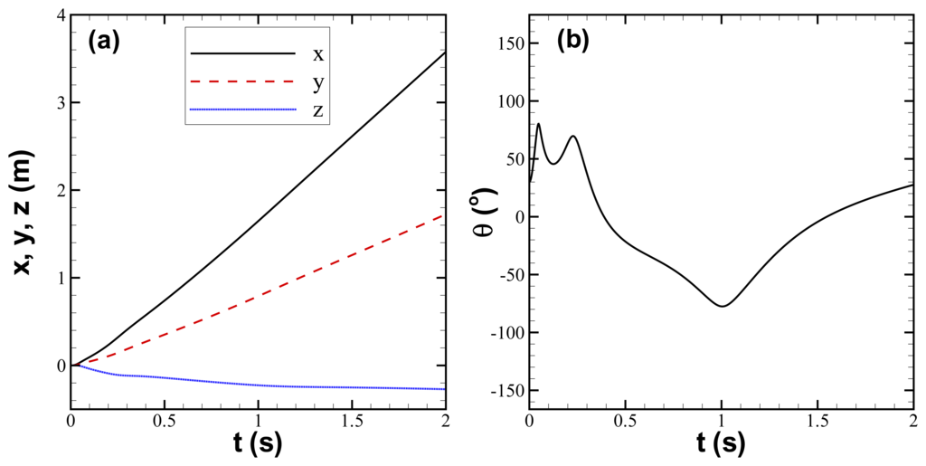 Trajectory of Sensor Fish for case 2 in two-dimensional uniform flow with the mass center and the geometric center of Sensor Fish overlapped, (a) x(t), y(t), and z(t); (b) θ(t).