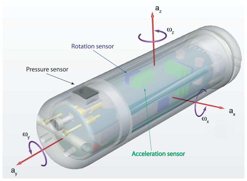 The Sensor Fish device showing the location of the measurement axes for the three rate gyros (that measure angular velocity, ω), three linear accelerometers (that measure the acceleration, a), and pressure transducers.