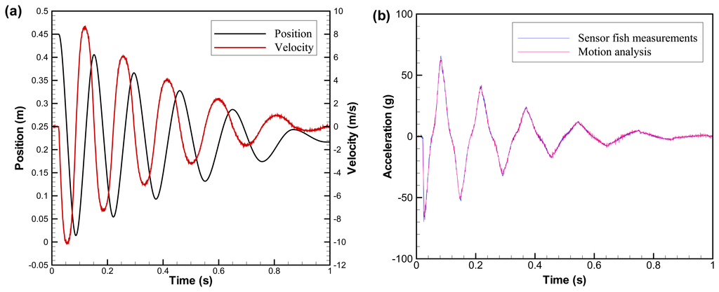 After assembly, acceleration measurements of Sensor Fish were calibrated in a linear acceleration test track in conjunction with high speed videography. The test track also had a built-in potentiometer that gives the positions of the sensors. Sensor Fish movement was recorded also using a digital high-speed camera (Photron PCI FastCAM 1280; Photron USA, Inc., San Diego, Calif.) equipped with a 50-mm lens. The camera is capable of a 500 frame-per-second frame rate at a resolution of 1,280 × 1,024 pixels and up to 16,000 frame-per-second at a reduced resolution. Trajectories of the sensors were obtained using a motion-tracking software package (Visual Fusion 4.2; Boeing-SVS Inc., Albuquerque, New Mexico). Velocity was then computed by numerical differentiation of the measured position trajectories. Acceleration was computed by numerical differentiation of the velocity time histories. Each axis of the tri-axial accelerometer set was individually checked under two different accelerating mechanisms: the unforced spring-mass-damper system and the collision system. For the unforced spring-mass-damper system, the Sensor Fish mounting plate was pulled to a certain displacement. After the accelerometers were activated, the mounting plate was released and set in motion. It moved with a progressively decreasing amplitude and eventually stopped moving due to damping (Figure 5a). The measurements by the accelerometers were almost identical to those by motion analysis, both in wave form and acceleration magnitude (Figure 5b). For the collision system, a stopper was installed in the linear motion and collided with the moving sensor fish, which simulated the collision between the Sensor Fish and hydraulic structures in the field. Because of the impact from the stopper, the Sensor Fish experienced a sudden change of velocity (Figure 6a), leading to a large acceleration magnitude. The collision process was captured accurately by the Sensor Fish (Figure 6b). The relative errors of linear acceleration measurements were determined to be less than 5%.