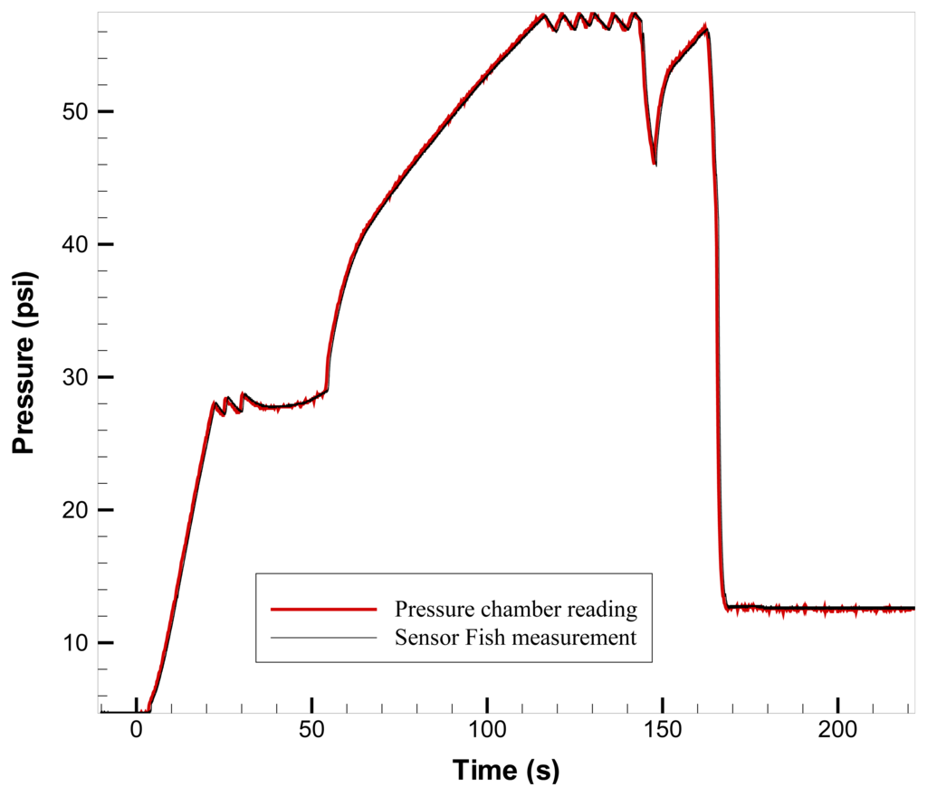 The pressure data acquired by the Sensor Fish during the exposure were compared to the pressure data file that controls the chamber pressure exciter and were measured by another pressure sensor located in the chamber (Figure 8). Multiple tests with different exposure histories and temperatures were conducted to confirm there was no effect of the assembly process or drift from different pressure exposures. It was found that there was a small offset for individual Sensor Fish. However, the offset is constant and temperature-independent. By subtracting the offset during the data converting process, the accuracy of the pressure sensor was determined to be within ±0.2 psi.