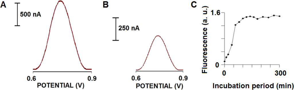 Electrochemical responses of 80 μM Aβ-42 before (A) and after (B) aggregation following an incubation for 120 min in TBS at 37±1°C. Square wave voltammetric measurements were taken using a glassy carbon electrode as the working electrode in a three-electrode system including a reference electrode (Ag/AgCl) and a Pt wire as the counter electrode; (C) Plot for the dependence of the fluorescence responses of Thioflavin-T on incubation period in the presence of 80 μM Aβ-42 in TBS at 37±1°C.