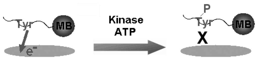 - Kerman, K.; Vestergaard, M.; Chikae, M.; Yamamura, S.; Tamiya, E. Label-free electrochemical detection of phosphorylated and non-phosphorylated forms of peptides based on tyrosine oxidation. Electrochem. Commun. 2007, 9, 976–980. [Google Scholar]