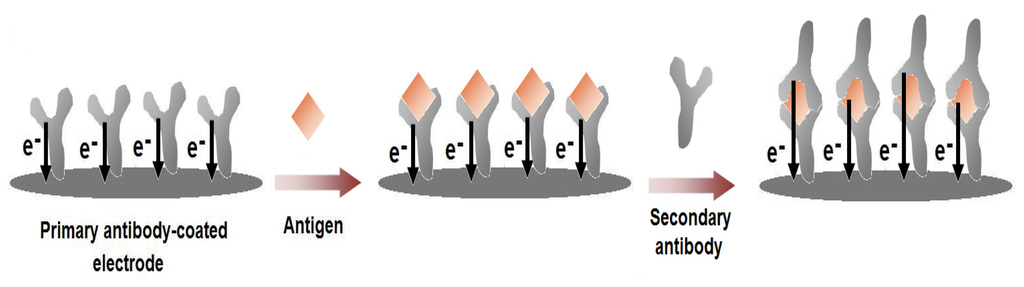 Schematic illustration for the label-free voltammetric immunosensors. The primary antibody is coated on the electrode surface and the electro-active residues in the antibody structure give a specific current response. Upon the binding of the target antigen with the antibody, the specific current response of the antibody layer changes. This change can either be an increase or a decrease depending on the structure of the antigen and/or the conformational changes that would occur upon the formation of the antigen-antibody complex. Then, the current responses would be further altered with the binding of the secondary antibody, which would also contribute to the current response with its intrinsic electro-activity.