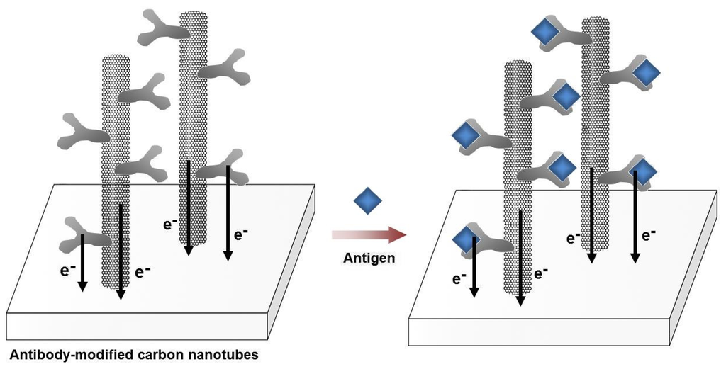Schematic illustration of the label-free immunosensors using single-walled carbon nanotubes (SWCNTs). SWCNTs were grown directly on the platinum electrode surface. Upon the covalent attachment of the antibodies on the SWCNTs, a current response is recorded from the intrinsic electro-activity of the antibodies. As the antigens are bound with the antibodies, the electrochemical responses change. The current height at the peak oxidation potential (∼0.5 V vs. Ag/AgCl) increases or decreases depending on the concentration of the bound antigens.