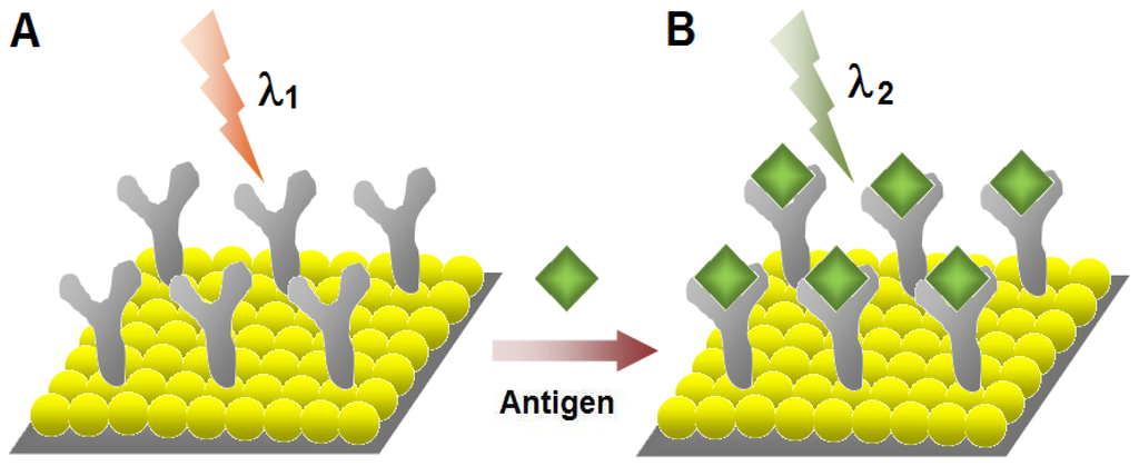 Schematic illustration for the label-free optical detection of target biomolecules using localized surface plasmon resonance (LSPR) of metal nanoparticles (NPs). (A) LSPR absorbance of the metal NPs (λ1) change as the layer of antibodies forms on the surface. (B) The binding of the antigens with the antibodies increases the layers on the surface and the absorbance intensity of the metal NPs increase (λ2) leading to sensitive detection of biorecognition events.