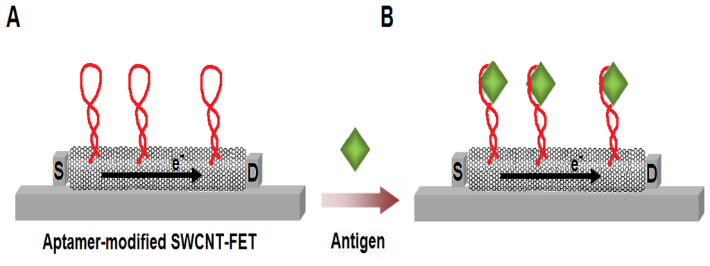 Schematic illustration of the SWCNT-based field-effect transistor (SWCNT-FET) for the label-free aptamer-based sensing. (A) As the aptamers are attached on the SWCNT, the electrical flow from the source (S) to the drain (D) of the system changes. (B) The current flow is further altered upon the binding of the antigens to the aptamers.