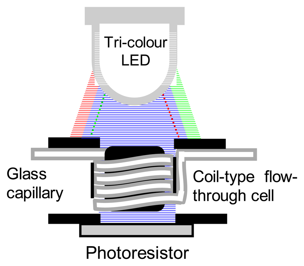 The need for multi-wavelength LED-based devices has led to different solutions. In 1990 Trojanowicz et al. used a commercially available photometer with a multi-diode light source and sequential switching of the diodes with different emission maxima for a simultaneous flow-injection determination of the aluminium and zinc in alloys [8]. A dual-wavelength detector based on a bi-colour LED was described two years later by Huang et al. [9]. Liu et al. reported on the coupling of the light from two separate LEDs into a single cell with bifurcated optical fibres [10]. A multi-LED photometer that employs a fibre-optic coupler to guide the light from up to seven LEDs into a single measuring cell was proposed by Hauser et al. [11]. The cell consists of a black Perspex body into which the fibre is inserted; it has a 1-cm path length and a cell volume of 8 μl.