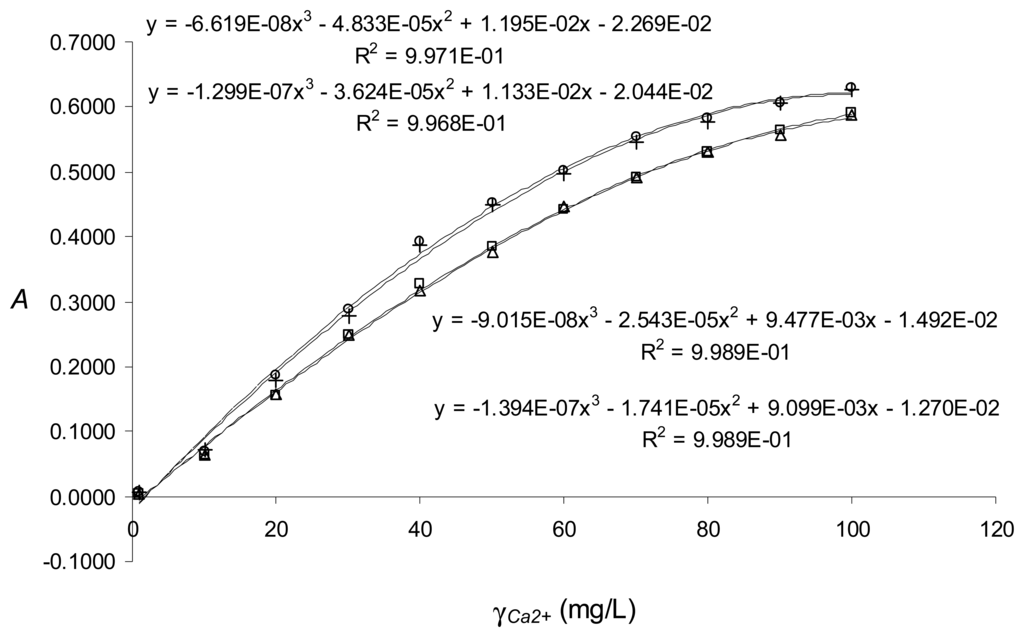 The peak heights obtained for two repeated sets of measurements in the FIA system with the T-7xd7 coil and the T-7xd16 coil relating to the concentration of calcium ions are presented in Figure 10. Smooth, repeatable curves with a 3rd-order polynomial trend line as a good fit were obtained. The correlation coefficients (r) were high: between 0.9984 and 0.9994. The shorter mixing coil (T-7xd7) gave a higher sensitivity. A more in-depth analysis of the results proved the linear relation between the peak height and calcium-ion concentration up to 40 mg/L. The resulting equations of the calibration lines are as follows: y = 1.013 10-2 × -1.562 10-2 (r = 0.9981) and y = 9.911 10-3 × -1.570 10-2 (r = 0.9980) for the set up with the higher sensitivity and y = 8.493 10-3 × -1.123 10-2 (r = 0.9989) and y = 8.255 10-3 × -8.510 10-3 (r = 0.9979) for the set up with the lower sensitivity.