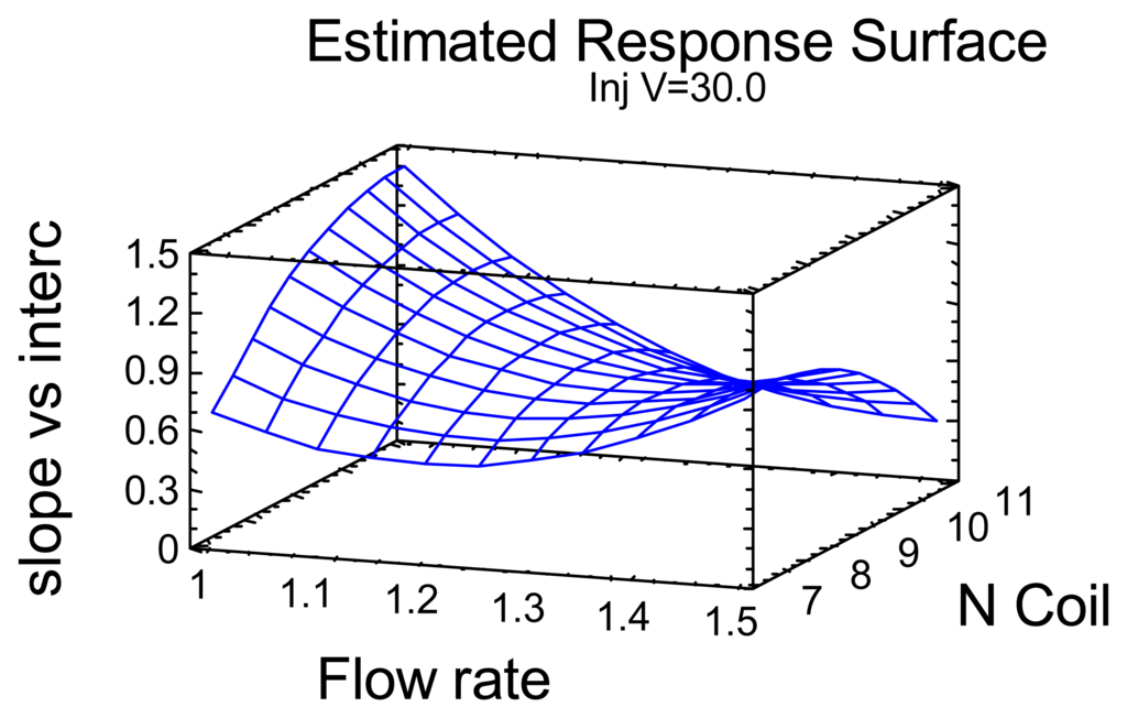 The Statgraphics Centurion - version XV software (Statpoint, Inc, Herndon, USA) was used for the experimental design selection and data analysis. The estimated response surface for the slope versus intercept quotient (b/a) at the 30 μL injection volume of the colour-forming reagent is shown in Figure 11. The optimal experimental conditions for the maximised slope versus intercept quotient that were recognised by the Statgraphics Centurion software are as follows: the 1.0 mL/min main stream flow rate, the mixing coil with 11 turns and the injection volume of the colour-forming reagent 25 μL. The same experimental conditions were suggested for the minimization of the intercept value. In spite of the fact that the optimum lies in the corner of the experimental design the prediction was recognised as an optimal solution. Subsequently lowering the flow rate and extending the mixing coil length might have resulted in an even higher slope versus intercept quotient, but it would also inevitably extend the peak elution time.