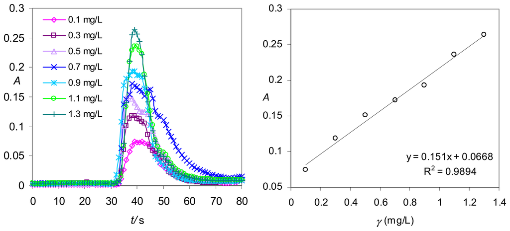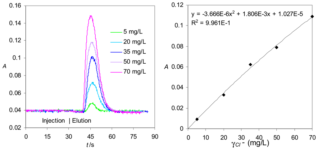 The peaks obtained for the calibration solutions (5–70 mg/L) in the flow-system (Figure 4) with a mixing coil (35.7 cm) and the spectrometric detector with the 11a cell are presented in Figure 9/left. The operation of the flow system was divided into the injection and elution periods, regulated by the precision interval switch. With a time-based injection, 29 μL of the calibration solution were introduced into the main line at a flow rate of 56 μL/min. At the moment of the elapsed injection time period, the precession interval switch switched on the main-stream pump, which operated at a flow rate of 1.25 mL/min. The peak heights were related to the chloride concentration, and a smooth polynomial line with a high correlation coefficient was obtained, as demonstrated in Figure 9/right. This experiment confirmed that the proposed spectrometric detector gives useful results and is sensitive enough for real-life applications in the range of the blue light, which was considered to be the most problematic.