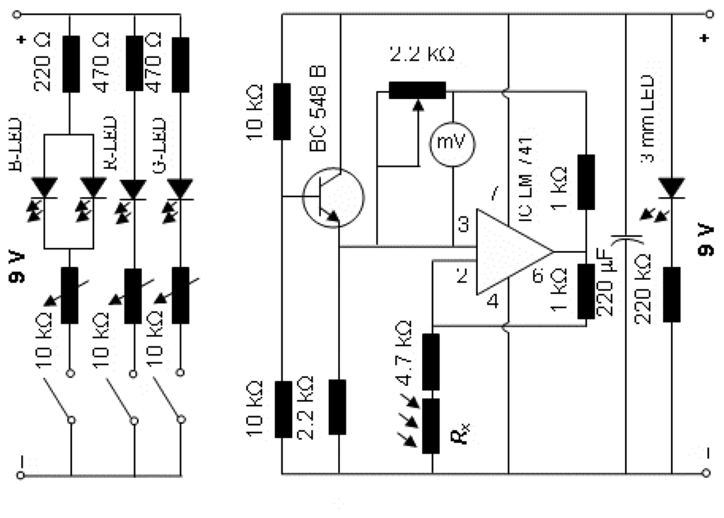 The electronic circuitry for powering the 5-mm white-diffused tri-colour LED (Kingbright®) and the photometric detection system arrangement based on a photoresistor (Rx) are schematically represented in Figure 15 (left/right). The design containing an unreferenced LED source and the signal linearly related to the transmittance was used. The light intensity of the emitters of red (R-LED), green (G-LED) and blue light (B-LED) can be regulated separately by using related potentiometers. In our studies the analogue output of the detector was basically acquired by a computer and by National Instruments LabView software. An appropriate virtual instrument was designed. The output is offset by a manually operated potentiometer. It should be stressed that due to the relatively wide peaks obtained with the proposed FIA system the requirements for the data-sampling rate are not high and several low-cost solutions for data registration or acquisition would do equally as well. The low-cost solution (€180) we used was a digital multimeter M-3860M, (Metex Corporation, Korea) with a serial output and supporting software.