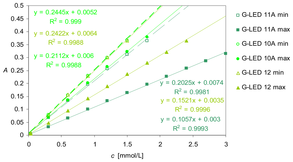 A 3-mmol/L potassium manganate(VII) solution proved to be a convenient stock solution for experiments in the range of the green light. Working solutions were prepared by further dilutions with deionised water, which was also used as a blank in the spectrometric measurements. The results of the linearity tests in the range of the green light are presented in Figure 2. The correlation coefficients demonstrate that the proposed spectrometric detector with a new coil-type flow-through cell exhibits good linearity in the range extending at least as far as the absorbance value 0.4. It should be mentioned that in this empirical detector with a specific optical geometry multi-wavelength absorption occurs in the wavelength range where the absorption spectrum of the absorbing species overlaps with the emission spectrum of the selected light emitter; therefore, it is not possible to compare these values with those obtained with a single-wavelength absorption in monochromator-based detectors. The results also prove that the light intensity has a significant effect on the detector's response, and a lower light intensity allows for a higher sensitivity. The highest sensitivity was observed for the cells with the lowest and highest internal volumes, i.e., 10a and 12. Cell 11a performed moderately well at the lowest light intensity, with the most significant improvement in the response being recorded when lowering the light intensity, if we compare it with the other two cells.