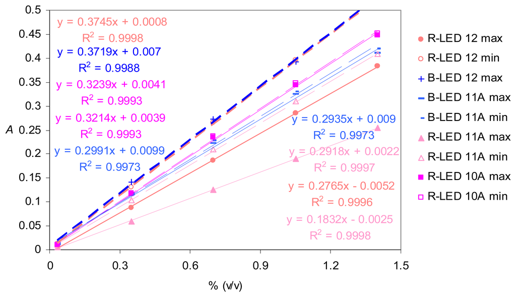 A stock Solution I (Experimental section 3.3) proved to be a suitable combination of food dies, E102, E110 and E131, for the detector's performance test in the range of the blue and red light because for this solution a spectrum with two wide, well-separated absorption peaks of similar height with absorption maxima at 418 and 662 nm, respectively, is obtained. For the test of the linearity the stock solution was further diluted with 20 mmol/L of ammonium acetate. The measurements were performed with all three coil-type flow-through cells against a 20-mmol/L ammonium acetate solution as a blank. The results are presented in Figure 3. The absorbencies in the range of the blue and red light are linearly related to the concentration up to the absorbance value of 0.45. This result is very similar to that obtained with the green light. The highest sensitivity was achieved with flow-through cell 12, and it was very similar for both the blue and red light. However, it should be pointed out that with this cell the spectrometric detector was at the limit of its ability in the range of the blue light and only the maximum light intensity with the highest amplification setting of the operational amplifier produced 100% transmittance. This is not at all surprising if we take into account the tri-colour LED's characteristics. The maximum luminous intensities reported by the producer are 90 mcd for red, 70 mcd for green and 12.5 mcd for each of the two blue light emitters. Consequently, an experiment in the blue-light range was not possible at all with cell 10a. This coil's diameter is obviously too small, preventing it from catching enough light to achieve 100% transmittance for the blank. Even in the range of the red light there was only just enough light due to the fact that the lines obtained for the 10a cell at the maximum and minimum light intensities nearly overlap. Here, again, the detector with flow-through cell 11a performed moderately well. Very similar responses were obtained in the blue-light range and at the minimum intensity of the red light.