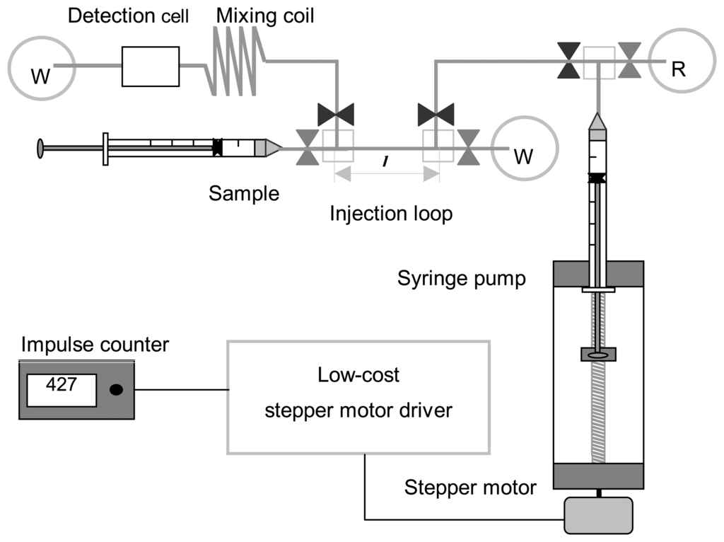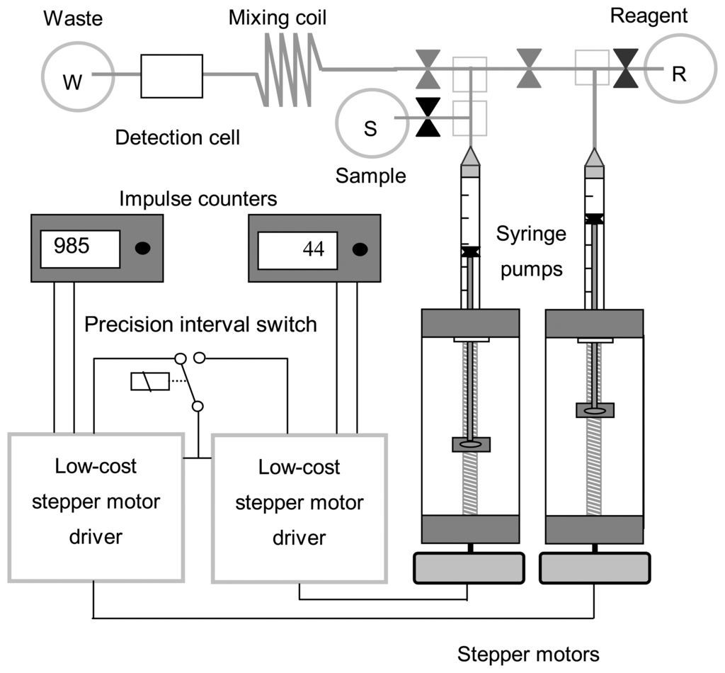 The low-cost FIA set-up is schematically represented in Figure 4. It consists of two laboratory-made syringe pumps - a main-stream pump and an injection pump - with related drivers wired to the precision interval switch, which enables time-based injection.