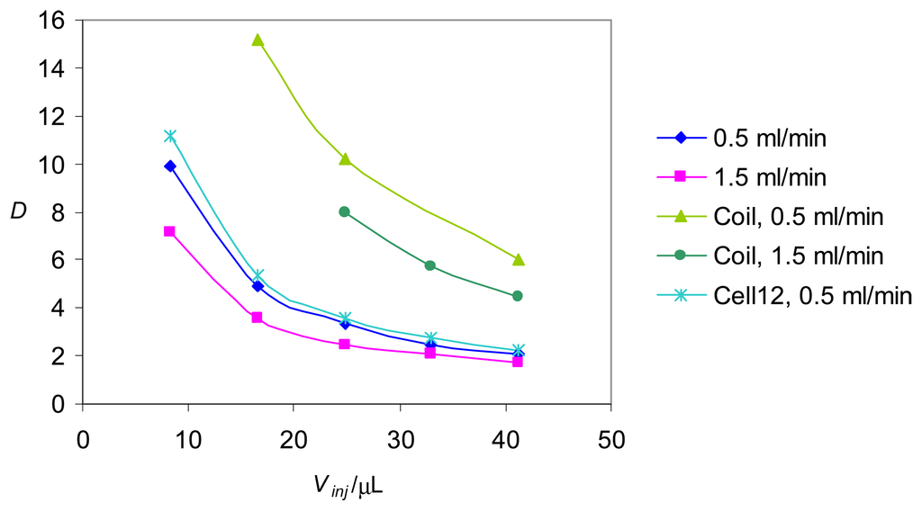 In order to make a FIA with the spectrometric detector even more suitable for low-budget circumstances, we additionally propose a low-cost simplified FIA set-up with time-based injection (Figure 4), the assembling of which is described in full detail in the Experimental section 3.2. We used such a set-up when testing the performance of the proposed spectrometric detector for flow-injection measurements. In order to test the operation and flexibility of the FIA set-up with the spectrometric detector the dispersion coefficients D, as introduced by Ruzicka and Hansen [12], were determined for different injection volumes and for different experimental conditions by comparing the absorbance maximum of an injected dye with the absorbance obtained when the spectrometric cell is completely filled with the dye solution. D is a measure of the dilution of the injected samples and is defined as the ratio C0/Cmax, where C0 is the analyte concentration in the original solution and the Cmax corresponds to the maximum of the peak on injection.