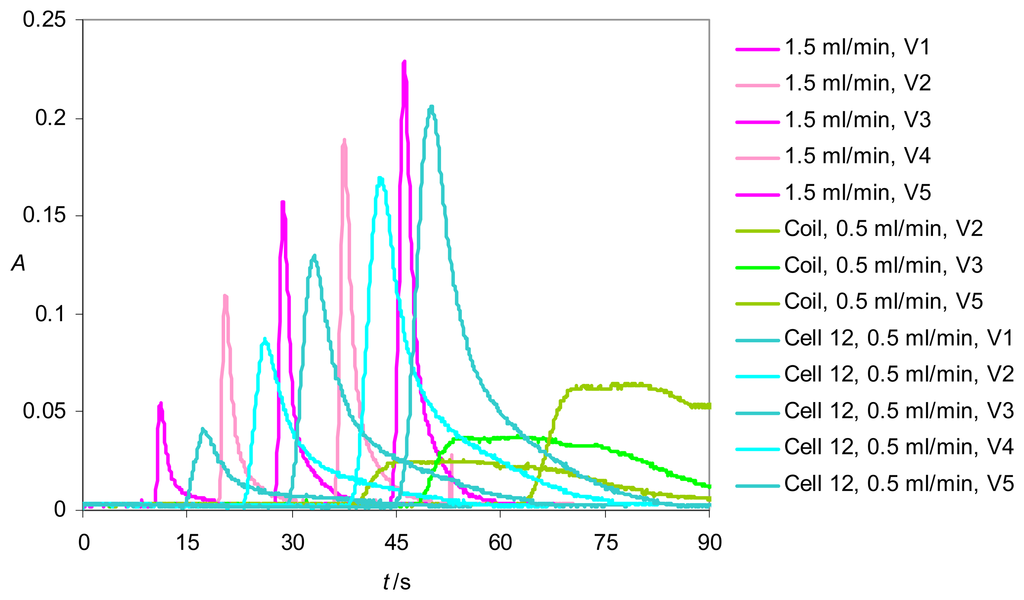The results, which are presented in Figure 5, proved that even though in its present form the FIA system with 1-mL syringe pumps has a maximum flow rate limited to 1.5 mL/min it allows for a wide variety of dispersion coefficients in the range of medium (D = 2−10) and large dispersions (D >10). The shapes of the peaks that were obtained for different dye-injection volumes, 8.3, 16.5, 24.8, 33.0 and 41.3 μL (V1-V5), under selected experimental conditions are presented in Figure 6. The peaks in magenta were obtained for the experimental series with the lowest dispersion (1.5 mL/min, 10a cell, no mixing coil), the peaks in green were obtained for the experimental series with the highest dispersion (0.5 mL/min, 10a cell, mixing coil, tubing length 35.2 cm) and the peaks in blue were obtained for the experimental series with moderate dispersion (0.5 mL/min, cell 12, no mixing coil). The shape of the peaks promises that low-cost data-acquisition devices with a limited data-point sampling rate are satisfactory.