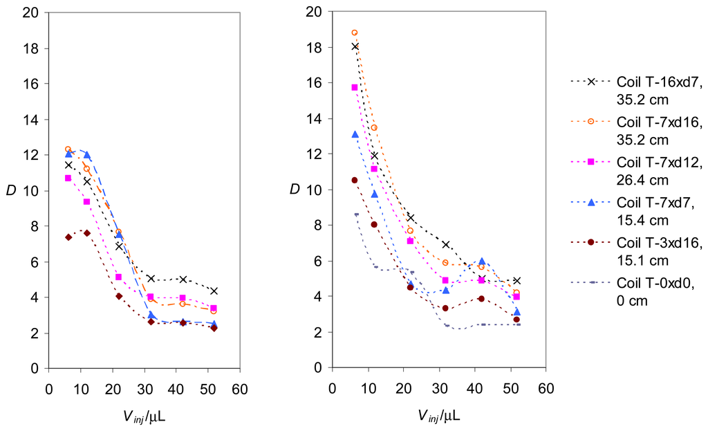 Dispersion coefficients obtained for different dye-injection volumes and mixing-coil lengths and geometries at the flow rates 1.5 ml/min (left) and 0.5 ml/min (right).