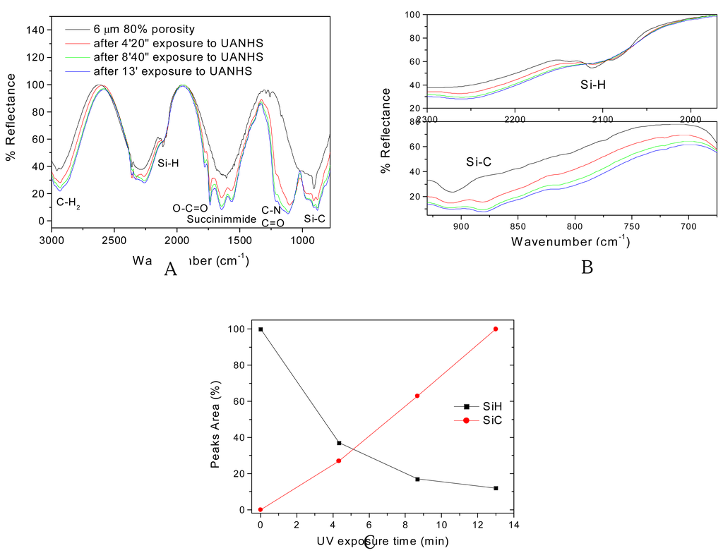 Infrared spectroscopy is a powerful tool in surfaces characterisation: it is fast, accurate and could also performe quantitative determinations. We have investigated all the PSi monolayers before and after the photochemical passivation process since we were worried about the functionalization efficiency of thicker samples. A thicker layer can adsorb more bioprobes than a thinner one but the UV exposure could also be less effective, due to light absorption by PSi at those frequencies. Our measurements demonstrate that up to 6 mm thick PSi monolayer, a complete passivation and functionalization of the surface can be obtained by exposing for a sufficiently long time the sample: in Figure 1A are shown the FT-IR spectra of the PSi monolayer as etched and after three different times of exposure to UV light.