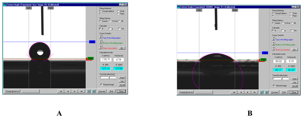 Contact angle measurements have been performed by using a KSV Instruments LTD CAM 200 Optical Contact Angle Meter.