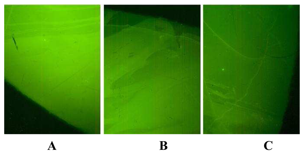 A) Fluorescence of the chip surface after the binding of the labelled ssDNA; B) after the overnight dialysis in HEPES solution; C) after the overnight dialysis in deionised water.