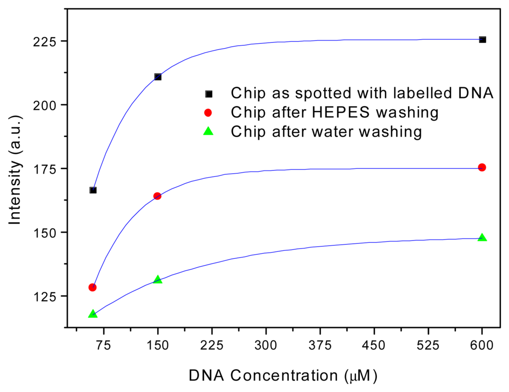 Fluorescence intensities of the chip surface after the binding of the labelled ssDNA and the two overnight dialysis as a function of the cDNA concentration.