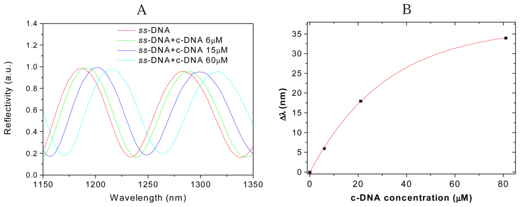 In Figure 5A the reflectivity spectra of the PSi layer for different cDNA concentration are reported, while in Figure 5B a dose-response curve is reported. A control measurement has been made using a ncDNA sequence: a very small shift (less than 2 nm) has been recorded in the reflectivity spectrum respect to the one obtained after the probe linking.