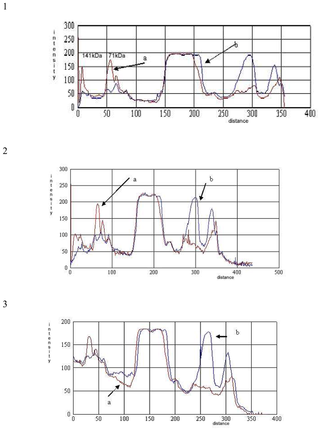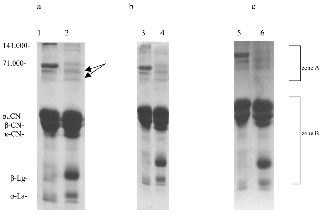 Contrary to α–La, the diffused bands of β-Lg and κ-casein represent only 1.84% and 1.89% out of the soluble milk proteins. According to our previous investigation [17], raw milk contains 5.27% and 22.30% of soluble κ-casein and β-Lg, respectively. This indicates the high level of denaturation during the skim milk preparation. Besides, this may imply that the 71kDa-, 141 kDa- bands are the soluble chemical complexes among κ-casein, β-Lg and α–La.