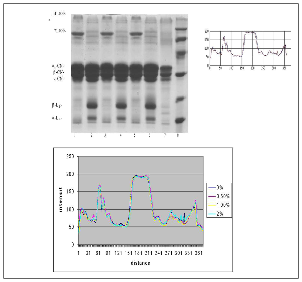 The SDS-PAGE pattern of the untreated reconstituted skim milk on 12.5 % gel; 1. 2. Reconstituted skim milk (the sample without and the sample with 2-mercaptoethanol, respectively), 3.α-La, 4. κ-casein, 5, 6. β-Lg, 7. β-casein, 8. Molecular weight standards. The SDS-electrophoretic profile of the soluble skim milk proteins (Fig. 1, line 1) contains five major bands identified as αs- casein, β-casein, α-La, 71 kDa-band, and three minor bands identified as β-Lg, κ-casein and 141 kDa-bands. According to the densitometric analysis (Fig. 2), the five major soluble components represent 83.71% of the soluble protein fraction. Furthermore, the content of the casein fraction and α–La is 69.86% and 6.92%, respectively.