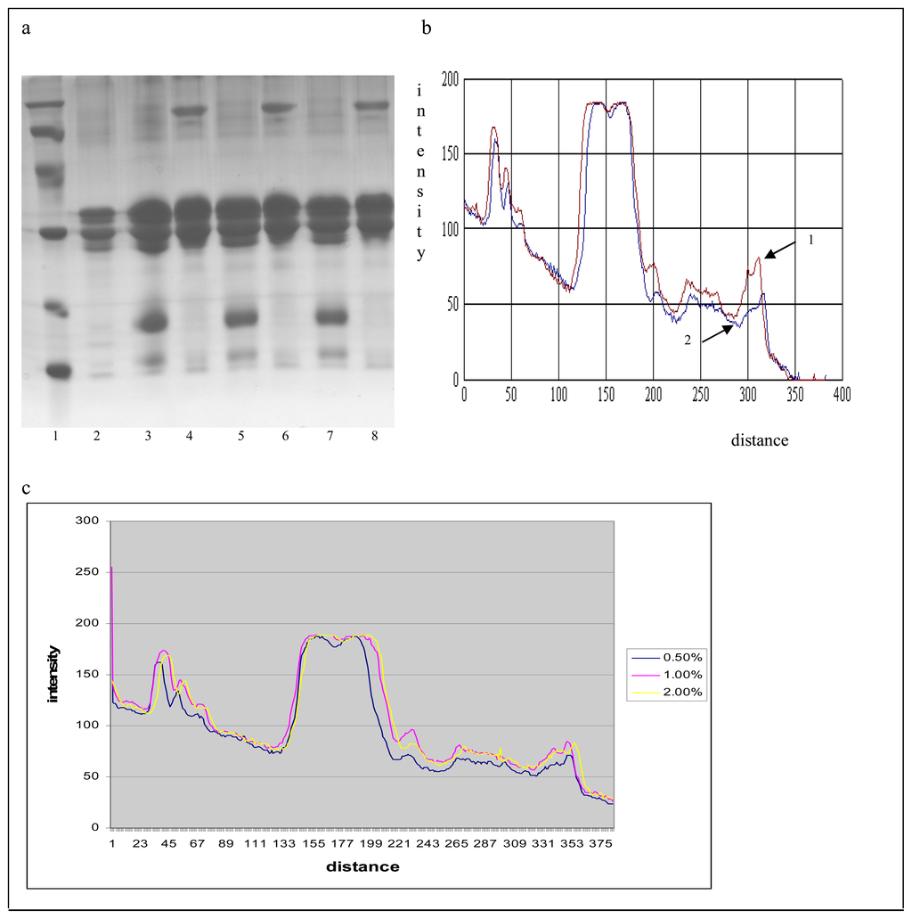 ) 0.5% of the demineralized whey. c. The comparative densitometric analysis of the samples treated with 0.5%, 1% and 2.0% of the demineralized whey added.*4, 6, 8- samples without 2-mercaptoethanol, and 3, 5, 7- samples with 2-mercaptoethanol.