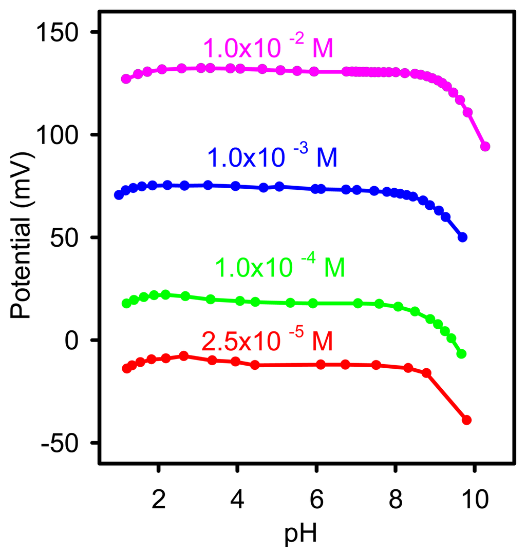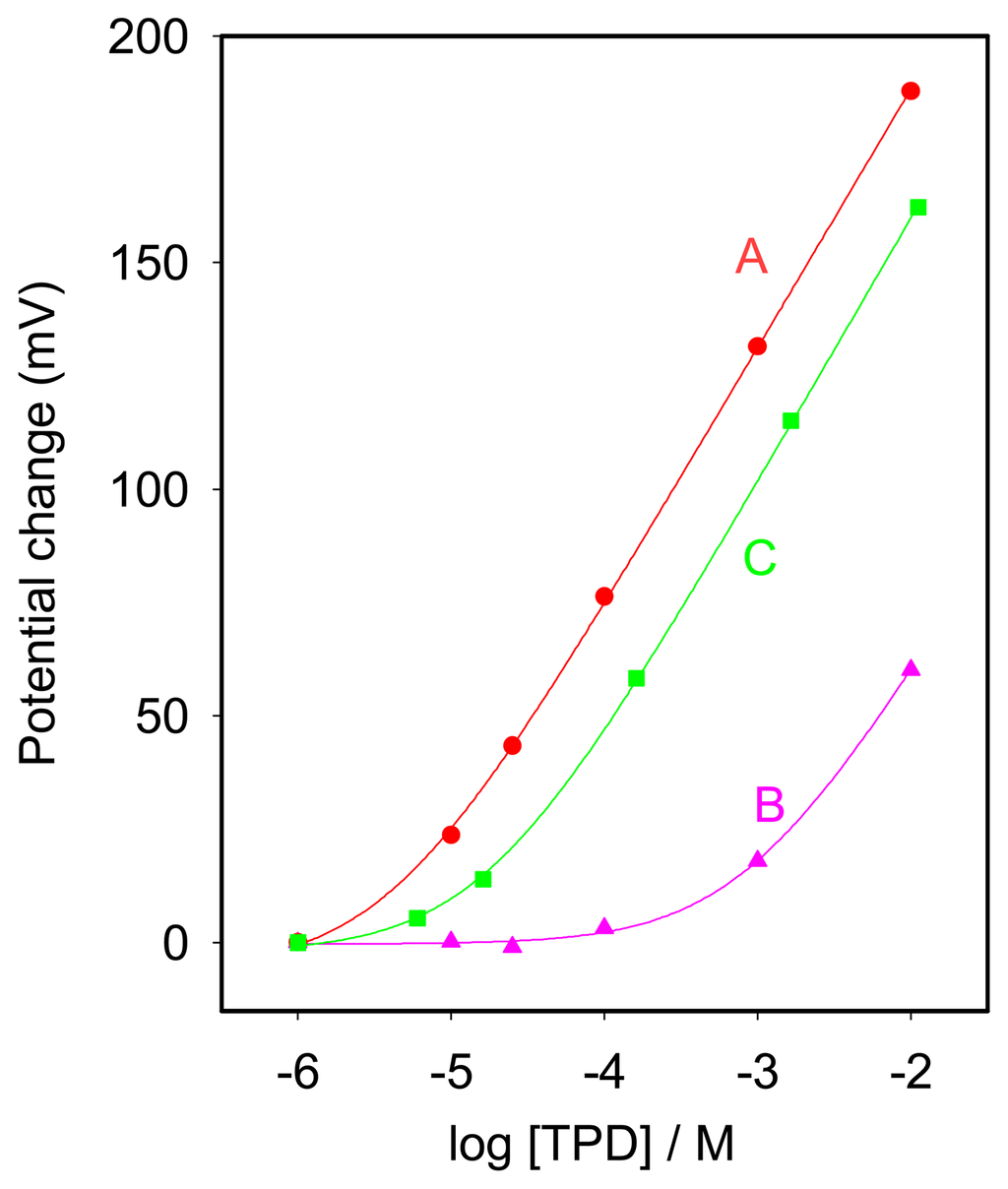 Selectivity coefficients for different ions with respect to tiapride were determined by the activity ratio method [21], in which the selectivity coefficient is measured as the ratio of ion activities or concentrations that generate the same membrane potential when measured in a separate solution type experiment. A tiapride calibration graph carried out in water was used to calculate the concentration of tiapride (CTPD) that corresponds to the potential observed for a certain concentration (Cj) of interfering ion. The selectivity coefficients were calculated as the ratio of these concentrations, KTPD, j = CTPD/Cj, where j is the interfering ion.