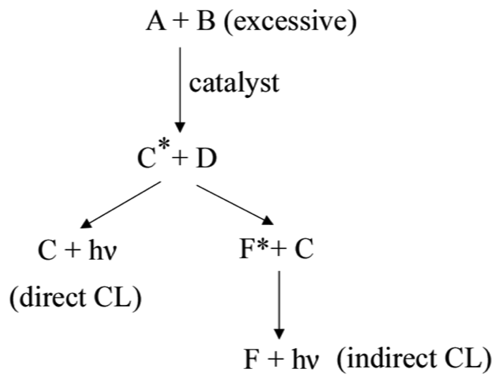 The main mechanisms leading to a chemiluminescent reaction: A, analyte; B, oxidant; C, D, product; F, fluorophore; *, the excited state; hν, luminescence.