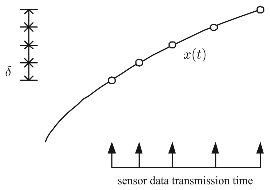 The conventional send-on-delta method [8, 9] is illustrated in Fig. 1. The sensor value is transmitted when the difference between the current value x(t) and the last transmitted value xlast(t) is larger than specified δ. In this method, the error (x(t) − xlast(t)) in the monitoring station (where sensor data are received) is always smaller than δ assuming there is no delay and packet loss during transmission.