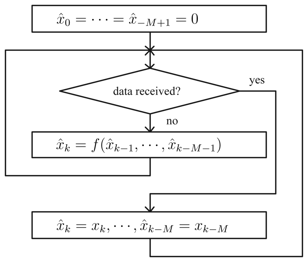 In the sensor node, x̂k = f(x̂k−1, ⋯, x̂k−M−1) indicates a linear predictor, where M denotes the memory length. If M = 1, x̂k is computed based on x̂k−1 and x̂k−2. How to choose a linear predictor f (·) is discussed later. Note that we use f (x̂k−1, ⋯, x̂k−M−1) instead of f (xk−1, ⋯, xk−M−1). If we used f (xk−1, ⋯, xk−M−1), we would have obtained more accurate x̂k; however in that case we have to transmit xk to the monitoring station at every T seconds. Thus we cannot reduce the number of transmission.