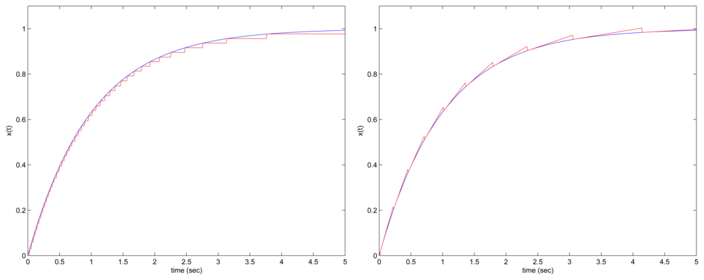 To see how the send-on-delta method and the proposed method work, x1 plots are given in Fig. 6. The left plot is the result of the send-on-delta method and the right plot is the result of the proposed method.