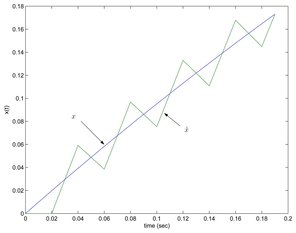 Actual number of sensor transmission is given in Table 4 for the time interval [0, 5] seconds. We chose the final time 5 seconds since the settling times of x1, x2, and x3 are all 5 second. For the oscillating signal x4, 5 second corresponds to a quarter cycle.