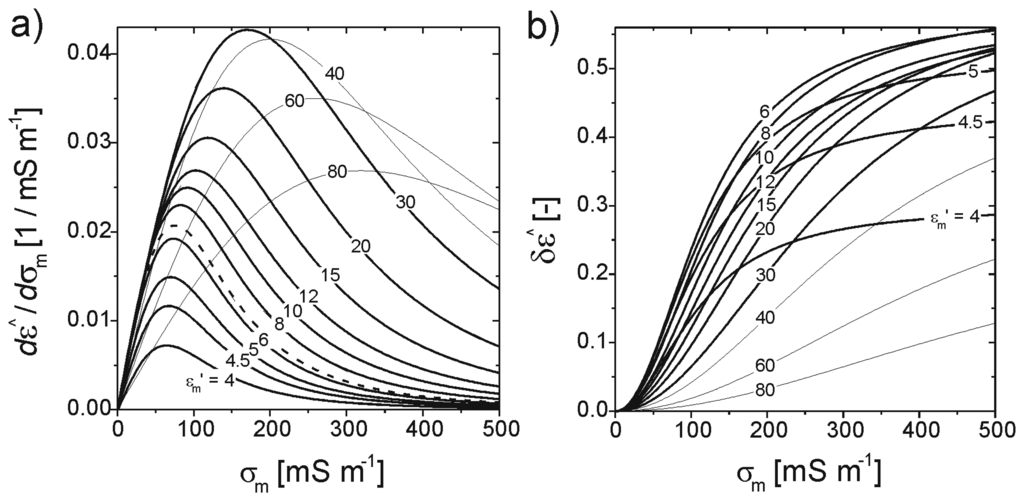 Simulated relative changes δε̂ = Δε̂ / εm′ of permittivities ε̂ measured with the capacitance sensor in conductive media are plotted in figure 11b. Wherein, the absolute change Δε̂ is defined as the difference between the simulated value in a non-conducting medium (σm = 0) and corresponding simulations for σm > 0 at the same water content θ. The difference Δε̂(εm′, σm) can be expressed using (29) as: