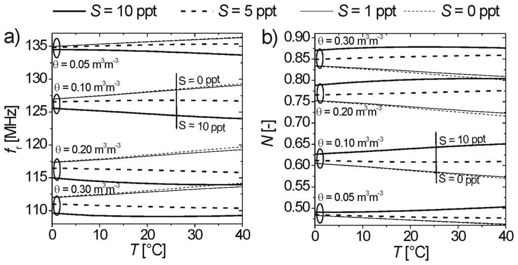 As S increases to 10 ppt, dfr(T)/ dT decreases and becomes negative, particularly for the intermediate water contents 0.10 m3 m-3 ≤ θ ≤ 0.20 m3 m-3. This behavior is in accordance with increasing losses leading to Rm within the sensitive range (10 Ω < Rm < 1000 Ω) affecting fr. Consequently, the gradients dfr(T)/dT are affected by dσm/dT which reaches highly positive values for large S (see figure 7) leading to dRm/dT < 0 (not shown here). The negative temperature coefficients dRm/dT < 0 explain the negative gradients dfr(T)/dT predicted for high S, because fr decreases with decreasing Rm (figure 9a). Normalized readings N(T) shown in figure 12b were computed from fr(T) using (1) with fr,a = 166.6 MHz and fr,w = 101.2 MHz respectively. As a result, dN/dT varies in the opposite directions of those for the corresponding dfr/dT.