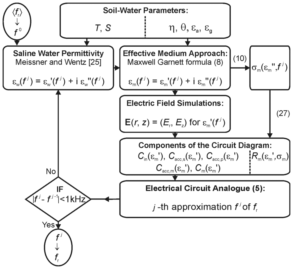 Flow-chart of the iterative approach for modeling the sensor resonance fr determined by the sensor properties (figure 1) and the effective permittivity εm of the porous solid-water-air medium (soil) surrounding the probe. Relevant equation numbers are indicated (in parentheses).