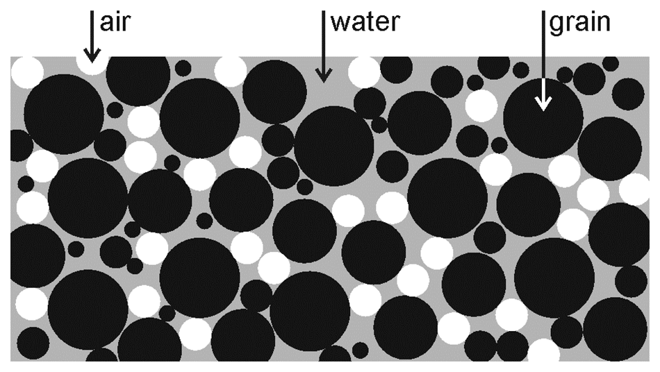 Schematic diagram of the structure of the porous medium used for modeling the effective medium permittivity εm representing the moist soil surrounding the sensor access tube. The grains with permittivity εg and the air-bubbles with permittivity εa are approximated by spherical inclusions in water with permittivity εw.