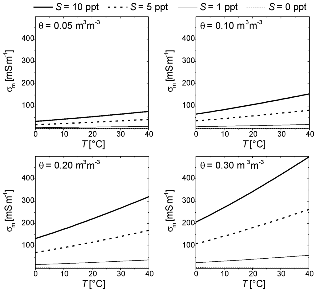 The same set of θ and S used in the calculations of εm(T) shown in figure 6 were selected for the computation of σm(T, θ, S) shown in figure 7. Again, σm increases with T for all θ and all S > 0. Values of σm ≈ 400 mS m-1 were modeled for T ≈ 30°C, θ = 0.30 m3m-3, and S = 10 ppt. Thus, the range of σm evaluated here is reasonable for the electrical conductivity of field soils. However, bulk electrical conductivity values of field soils are not necessarily the exclusive result of soil-water salinity. The implied relationship between S and σm is limited to “ideal” granular media, but many soils with clay minerals exhibit enhanced electrical conductivity even for non-saline soil water. Nevertheless, the relationship in (10) for σm(εm″) remains valid.