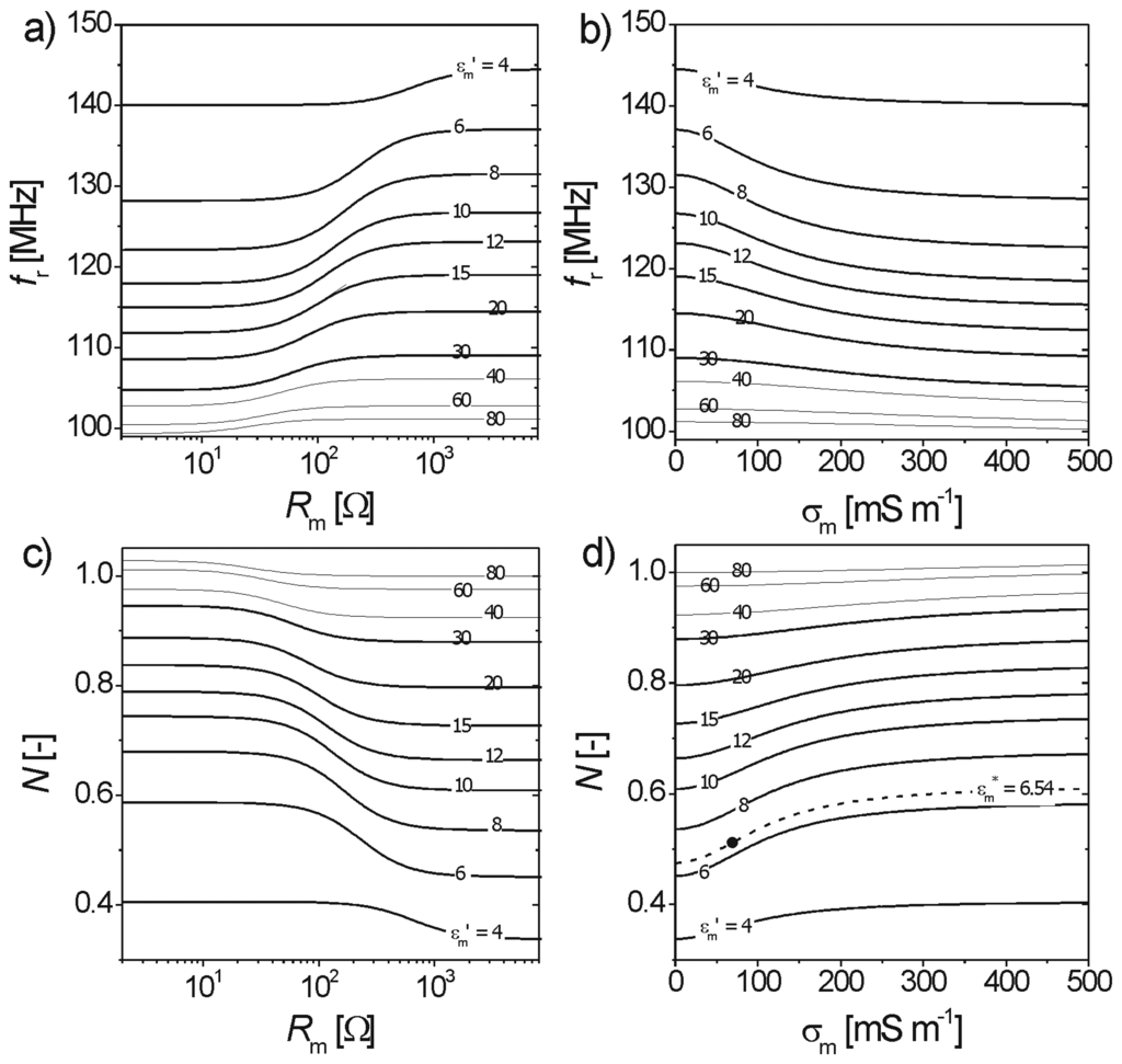 For a realistic range of soil permittivities εm′ < 30, the resonant frequencies shown in figure 9a and b (bold lines) are in the range of 104 MHz to 144 MHz and monotonically increasing with decreasing εm′. This behavior is in accordance with the increasing resonant frequency of a simple LC-oscillator with decreasing capacitance (compare (6)). Furthermore, for all εm′ the computed fr(Rm) shown in figure 9a takes asymptotically lower values for low Rm and reaches asymptotically higher values for large Rm. This emanates from the circuit diagram (figure 1), revealing that the total capacitance reaches a minimum for Rm → ∞ when Cm(εm′) is in series with Cacc,s(εm′) and a maximum value for Rm → 0 when Cm(εm′) is bypassed. Thus, the resonances of basic LC-oscillators with different operative capacitances (see Equation (6)) qualitatively explains the behavior of fr(Rm) for low and high values of Rm.
